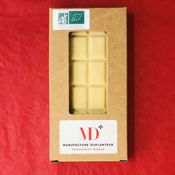Notre Chocolat Blanc BIO est fait de pur beurre de cacao naturel. Vous retrouverez des notes fruitées et sa texture est ronde, onctueuse et veloutée.